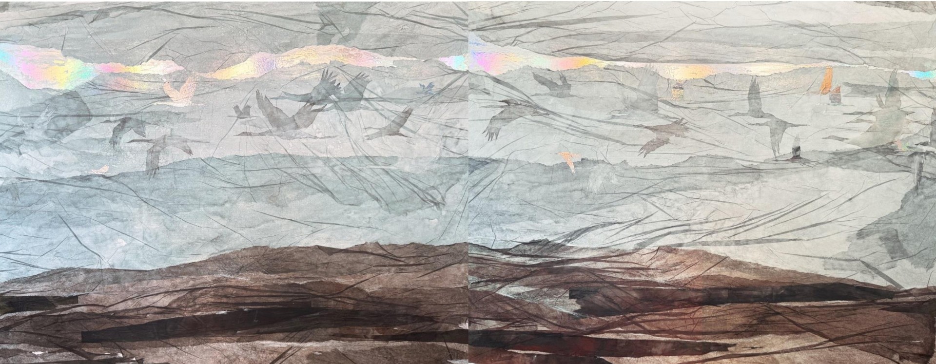 Работа представляет собой исследование контрастов, метафор и новых возможностей, открывающихся благодаря сочетанию древних техник и современных материалов. Металлизированная бумага, играющая с отражением света и создающая эффект голографической многослойности, символизирует динамику современного мира, его быстротечность и изменчивость. В то же время старинная японская бумага, обладающая глубиной и текстурой, олицетворяя сохранение традиции.