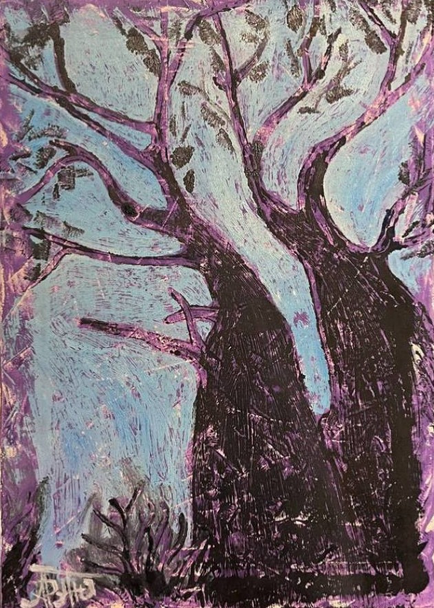 Оттиск масляными красками Дерева в осеннем саду. Стволы и ветви на фоне утреннего неба, спокойное начало дня, гармония и контрасты природы.