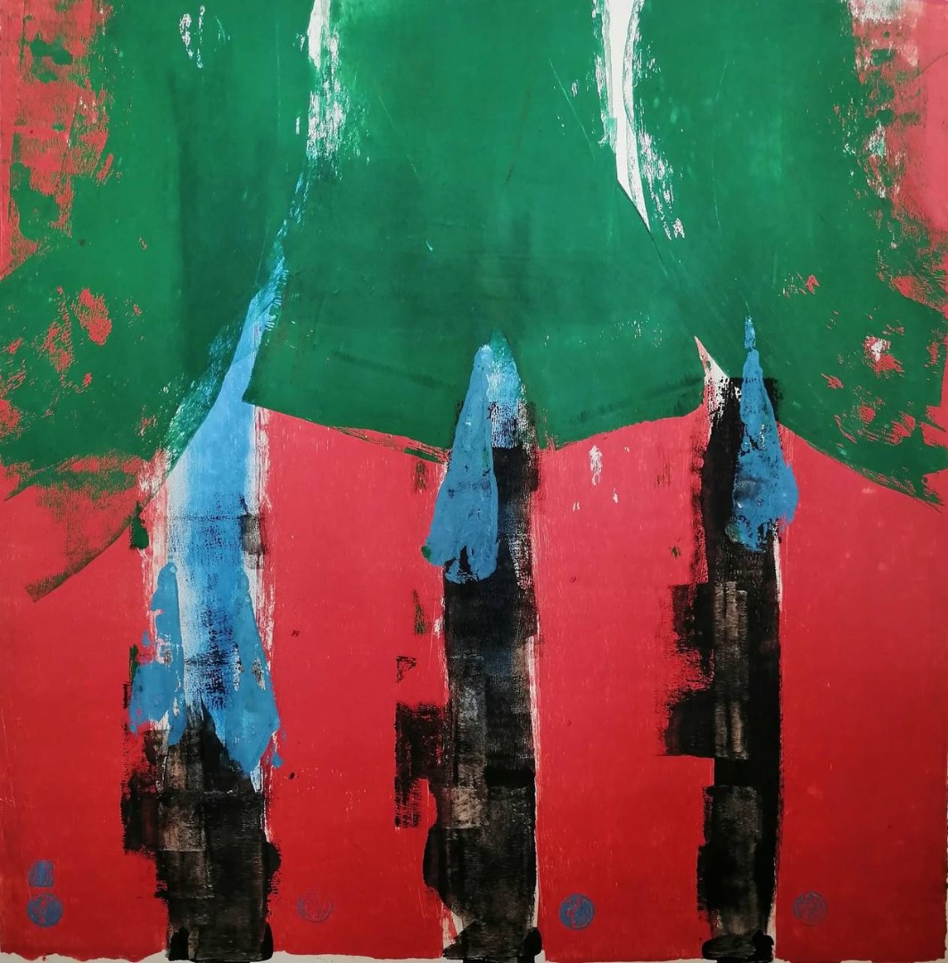 Бессюжетные пейзажи с чёткими ритмами вызывают почти звуковые ощущения. Противостояние красного и зелёного усиливает эти ритмы. Хотелось передать силу, мощь, строй и шаг стволов этих деревьев — как бесконечно масштабное движение жизни.