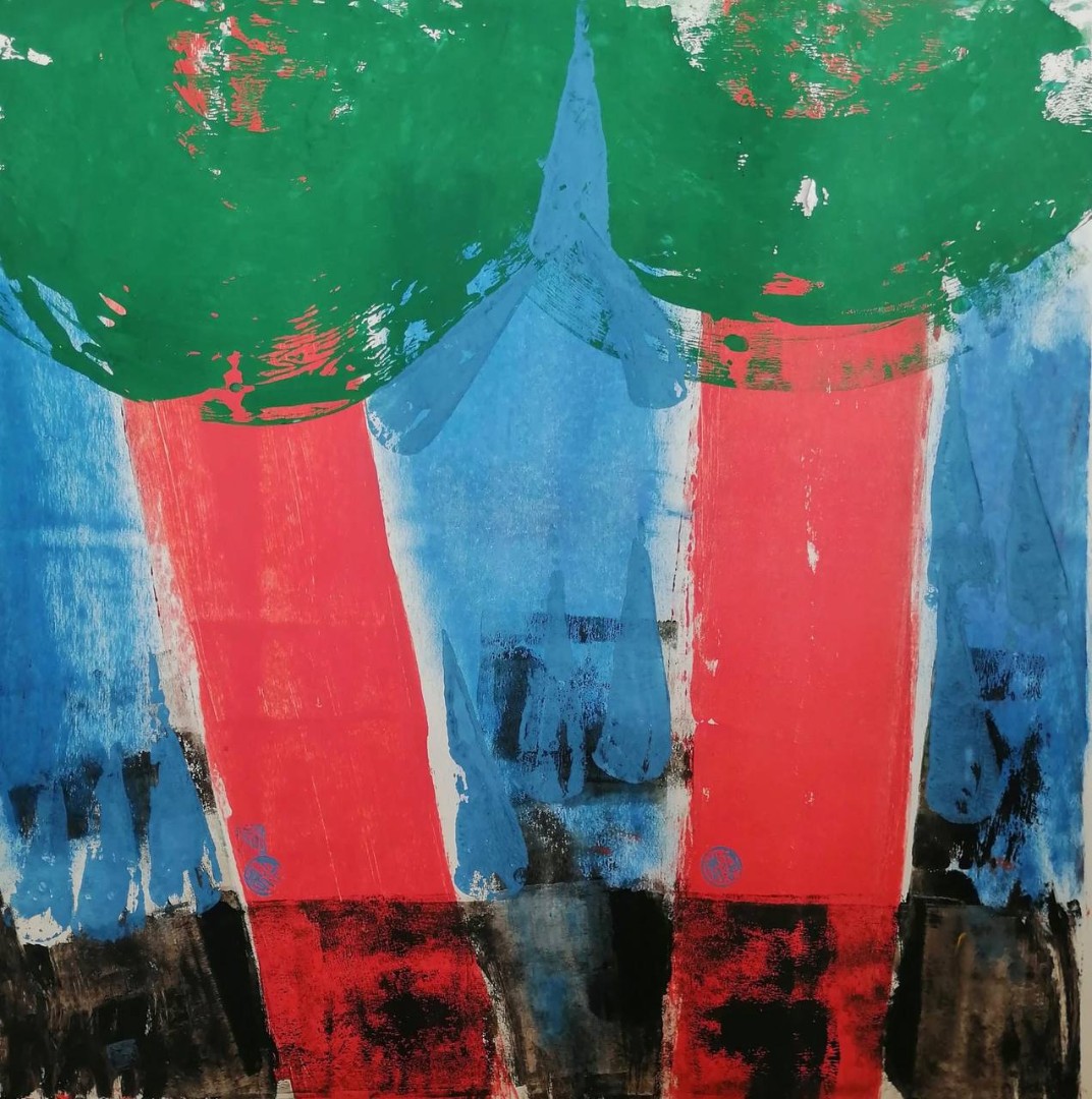 Бессюжетные пейзажи с чёткими ритмами вызывают почти звуковые ощущения. Противостояние красного и зелёного усиливает эти ритмы. Хотелось передать силу, мощь, строй и шаг стволов этих деревьев — как бесконечно масштабное движение жизни.