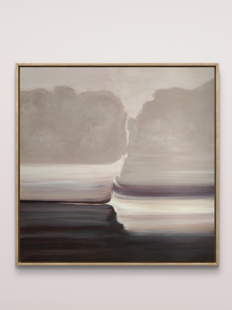 Ниже располагается горизонтальная область, разделенная на полосы разных оттенков коричневого, черничного и бежевого. Полосы создают впечатление движения или отражения на водной поверхности. Нижняя часть картины окрашена в самый темный оттенок черничного, что создает эффект глубины или тени. Композиция выглядит минималистичной и создает впечатление спокойствия.