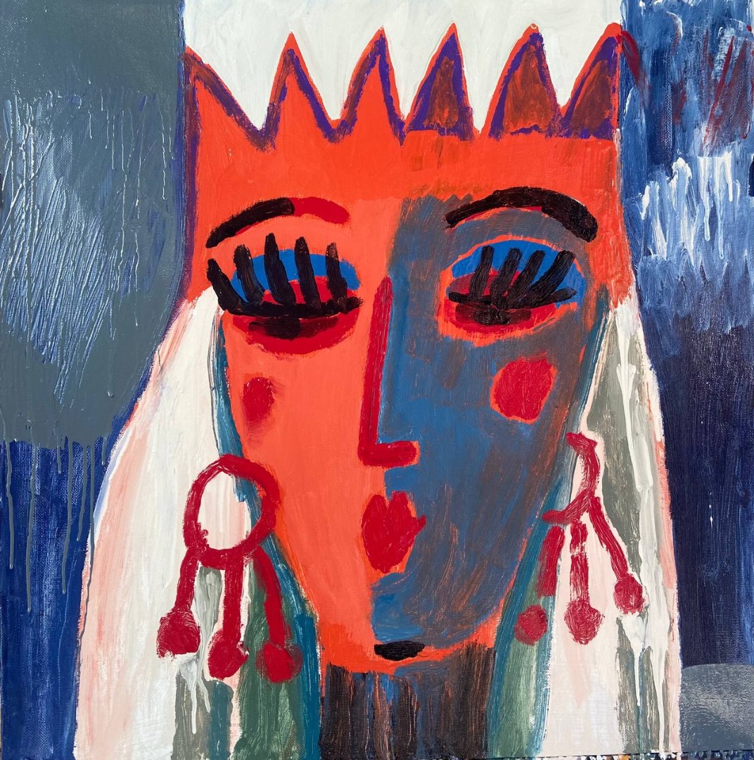Я знаю, что я не одна такая, и многие девочки в детстве тоже восхищались тем, что было у их мам: косметикой, духами, украшениями, туфлями… синими тенями! Как часто я красилась ими перед зеркалом и как была счастлива от своей красоты! В мой стиль жизни пока ни тени, ни корона не вписались, но на картине всё это есть!