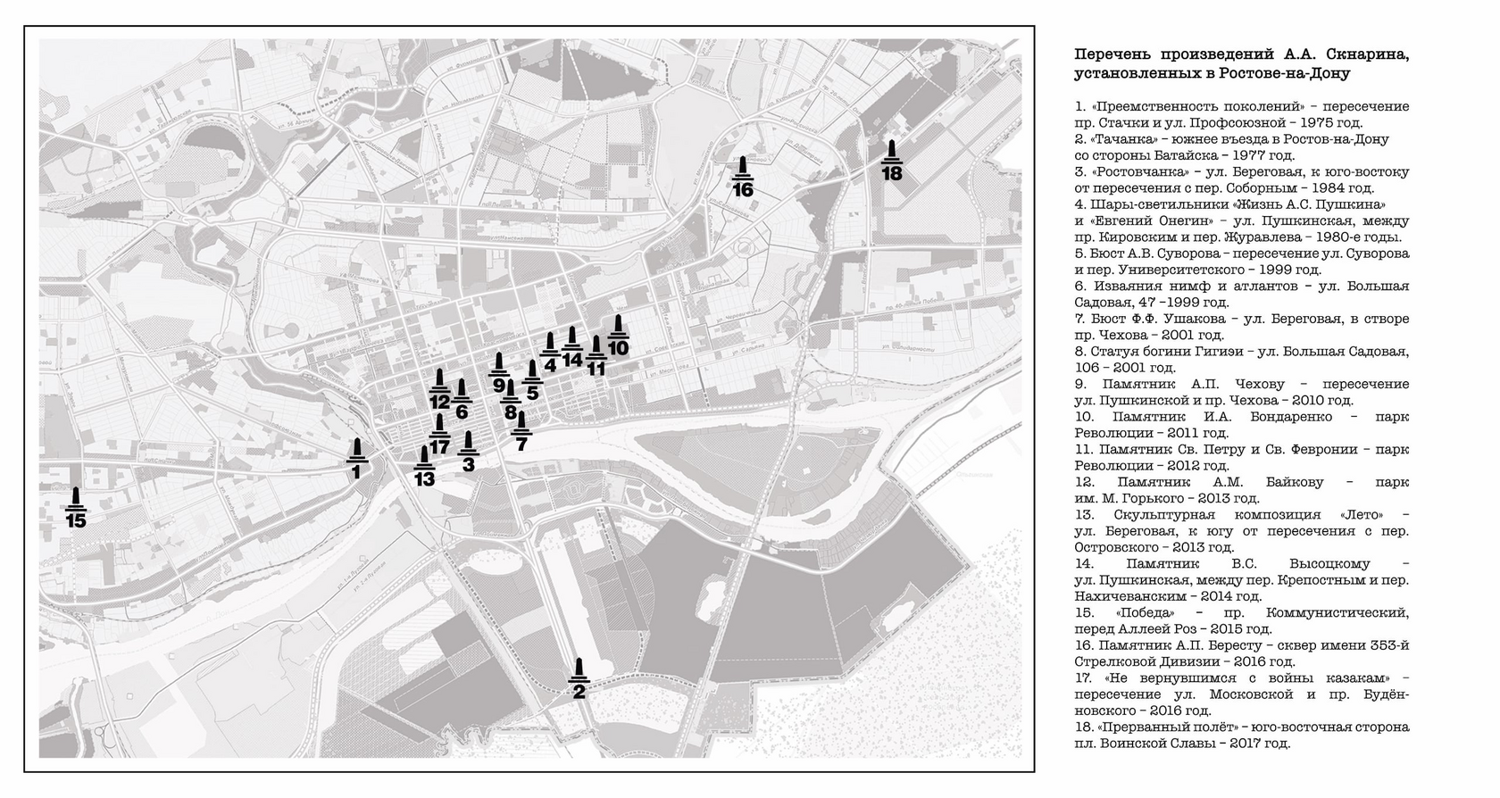 Анатолий Андреевич стал автором шаров на Пушкинской. Скульптор предложил идею шаров-светильников, которые должны были освещать улицу вечером и ночью, рассказывая о жизни и произведениях Пушкина. Всего по его проектам было установлено около 20 памятников в Ростова-на-Дону и 10 — в других городах.